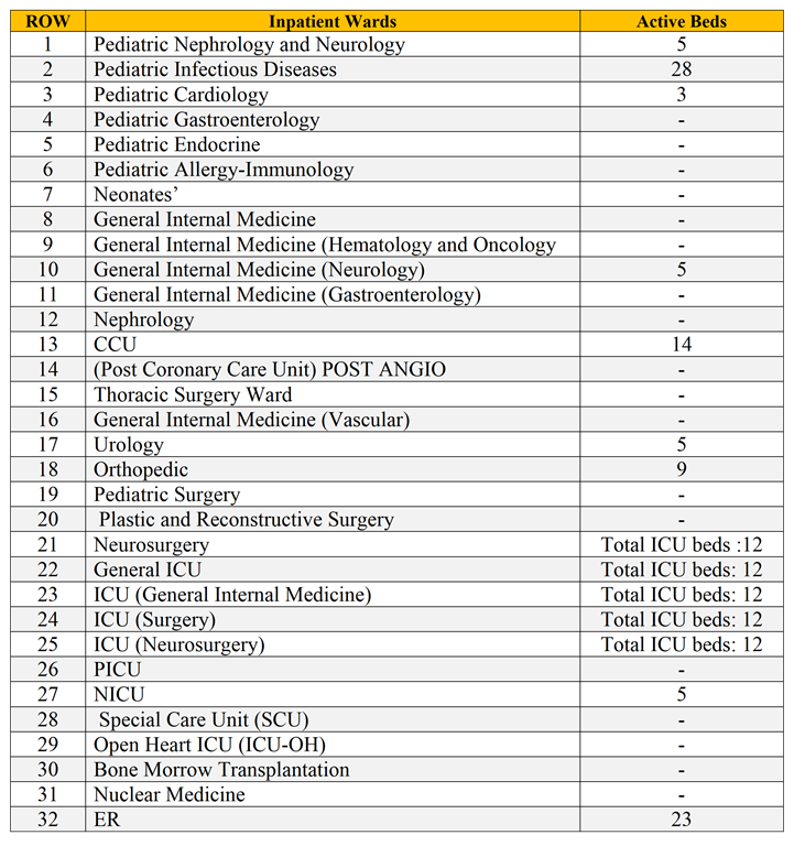 General Surgery, Internal Medicine, Obstetrics, ICU, CCU and POST CCU, NICU, Emergency, Psychiatry, Pediatrics, Neonatology, Dialysis and Thalassemia